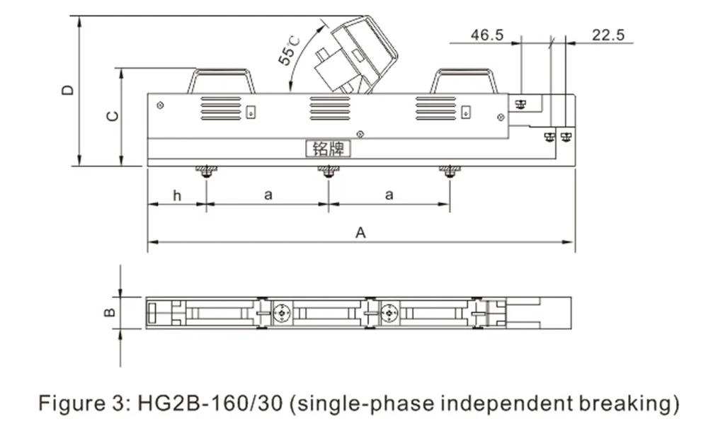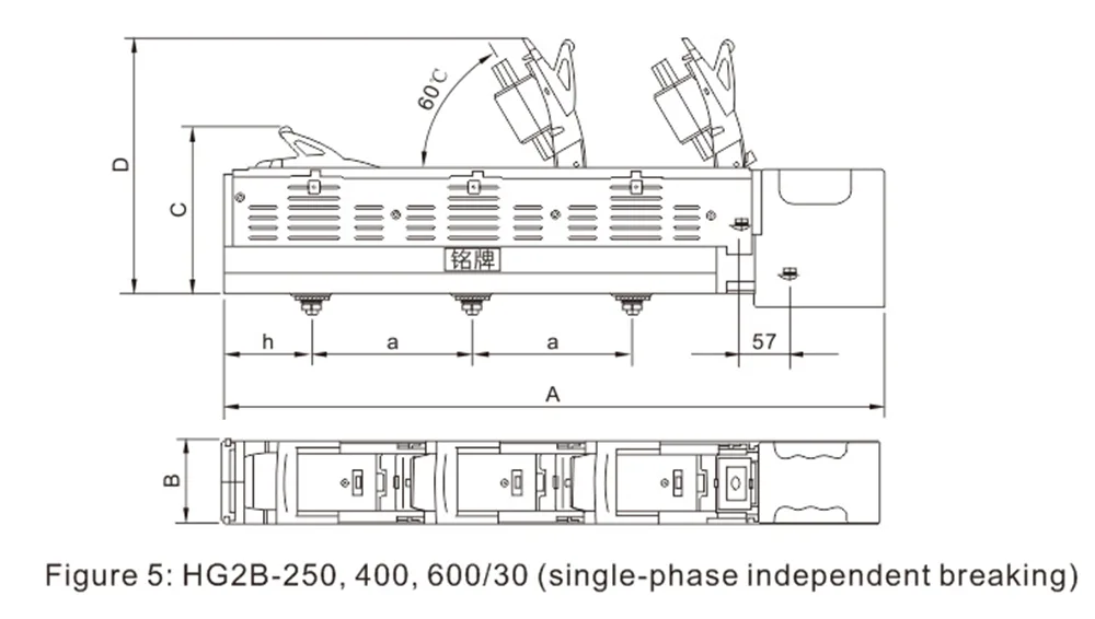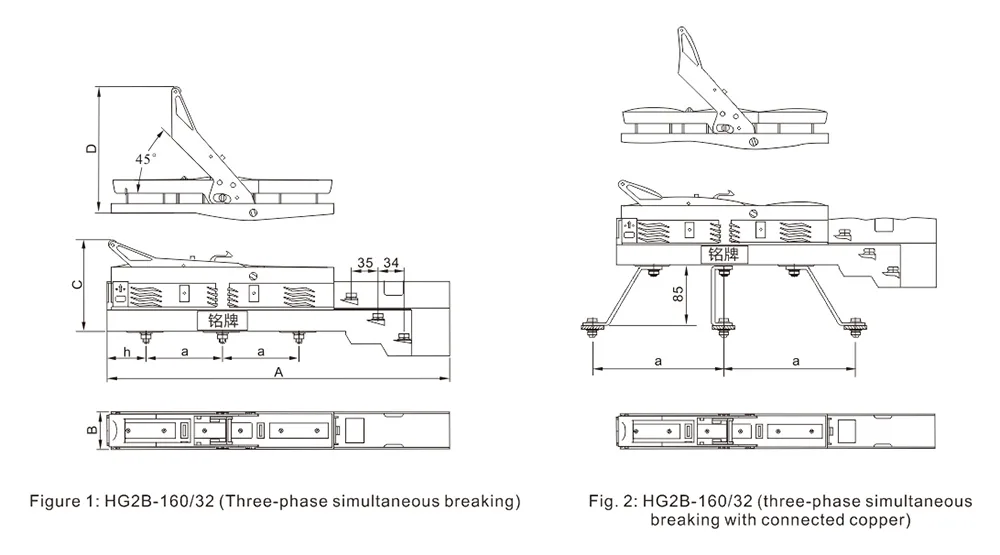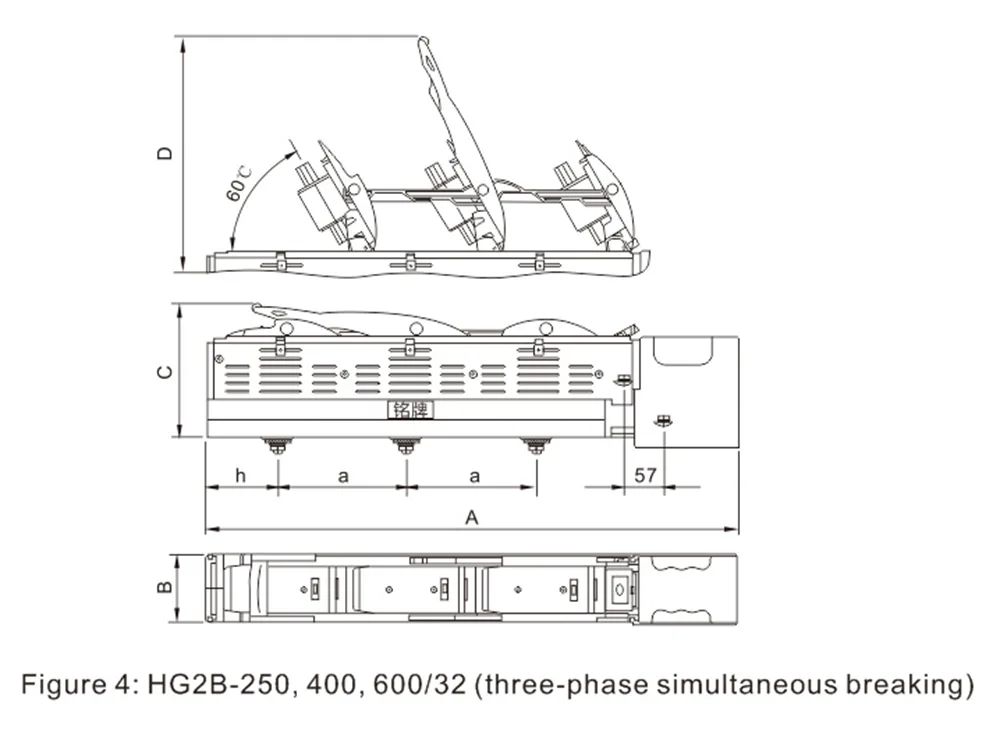 Aperçu et dimensions d'installation de l'interrupteur-sectionneur à fusible en ligne HG2B-160 ~ 630A.
