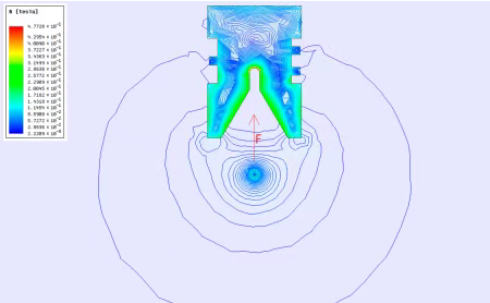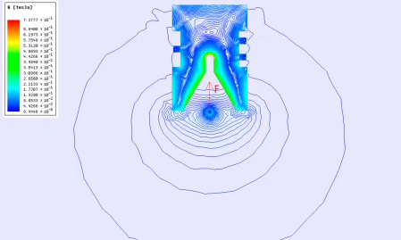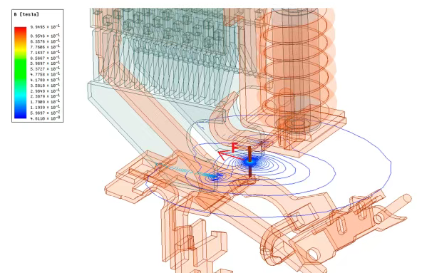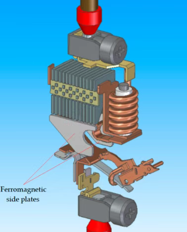 ● Courbes bleues en forme de bobine: Lignes de champ magnétique autour du courant d'arc, indiquant que le champ magnétique autour de l'arc est inégalement réparti mais polarisé par la géométrie du conducteur et les composants ferromagnétiques.