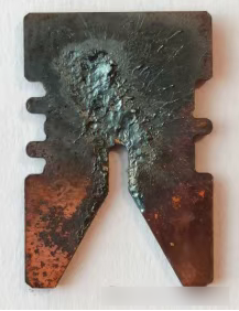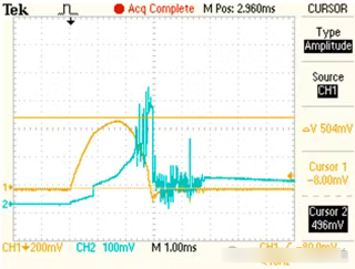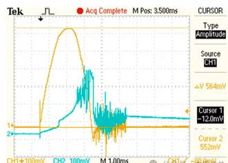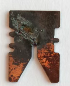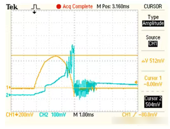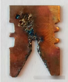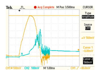 La forme d'onde est plus intense avec une sonnerie évidente après troncature. La chambre de coupure présente un noircissement important et une accumulation de matière fondue.